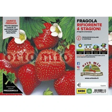 La fragola rifiorente, o 4 stagioni, produce tutto l’anno a condizione che non sia troppo freddo (temperatura ideale 20/25 °C). Frutto grosso e dolce. Per avere raccolte copiose si raccomanda di trapiantare almeno 12/18 piante. Produce a circa 3 mesi dal trapianto.