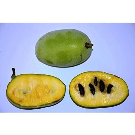 La pianta di Asimina triloba è un albero da frutto appartenente alla famiglia Annonaceae, chiamato anche Banano del Nord o di Montagna, è originario della parte orientali degli Stati Uniti, noto anche come Paw paw, dal nome in uso presso gli Indiani d’America. La pianta di Asimina è un albero di medie dimensioni a portamento ascendente, alto fino a 5–6 metri, ha grandi foglie alterne, lanceolate, caduche di 15–20 cm di lunghezza, pendenti con corteccia grigia. I frutti sono grandi bacche ovali, simili nella forma a pere più o meno cilindriche, lunghe di 6–18 cm ed oltre di lunghezza e di 3–8 cm di larghezza, a volte a forma leggermente lobata. I frutti sono singoli o spesso riuniti a gruppi a costituire delle “mani” vagamente simili nella struttura a quelle delle banane. Il peso dei frutti è ordinariamente da 50–100 g a 250–400 g ed oltre l’uno. I frutti contengono numerosi semi bruni, disposti in due file, molto duri, anche di notevole dimensione (lunghi fino a 2–3 cm), simili a grossi fagioli allungati. La polpa del frutto è a consistenza densa, soda, cremosa, bianca o a volte di colore tendente al giallo, è dolce e profumata, di sapore complesso e privo di acidità, a frutto immaturo invece è di sapore acre ed astringente. La polpa del frutto è anche ricca in vitamine e sali minerali, ha una quantità inconsuetamente alta di proteine. Integratore idro-salino, contiene ferro, calcio e fosforo. La maturazione dei frutti è tardo estiva o autunnale, dalla fine di Agosto a Settembre (Ottobre nei paesi più freddi); dato che i fiori non si aprono tutti assieme ma in periodo di oltre un mese, così anche i frutti giungono a maturità gradualmente in un periodo di tempo di 30-45 giorni. Temperatura minima: -20 °C.