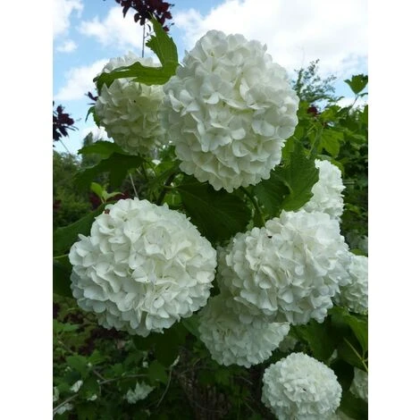 Viburnum opulus, detto Palla di neve, alto fino a 5 metri, molto ramificato e compatto con fiori bianche e profumati riuniti in infiorescenze terminali. In autunno la pianta si riempirà di bacche rosse molto decorative.